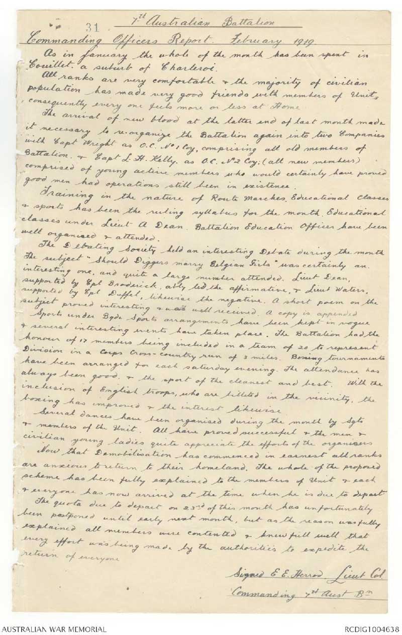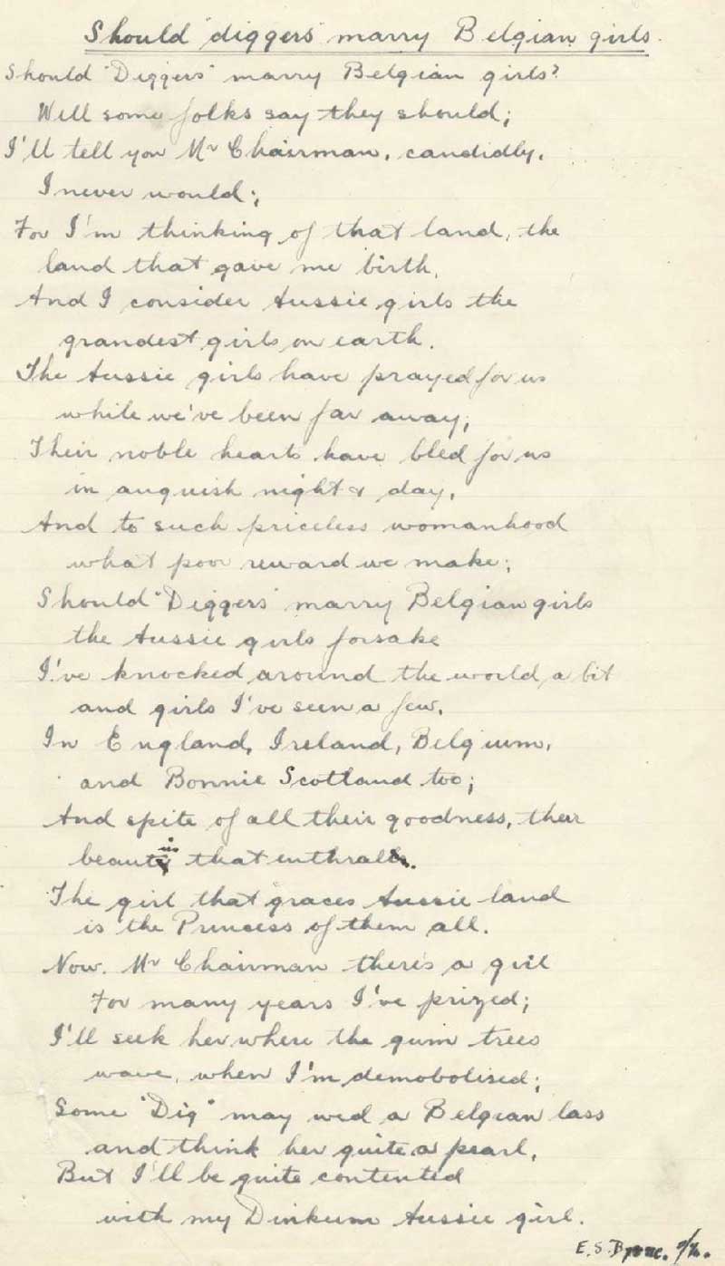 "Should Diggers Marry Belgian Girls"Poem written by Evelyn for a formal debate betweem 7th Battalion soldiers stationed in Belgium in 1919 The poem is found in the War Diary on the Australian War Museum website - https://www.awm.gov.au/collection/C1338583?search -