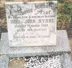 3. Mick (Michael) Byrne 1875-1949Born 10th May 1875 at Kadnook Harrow (9561). He married Janie McLure in 1900 (3383). Jane was born 1st January 1874 in Natimuk. They spent the early years of their married life farming at Gymbowen where Michael's uncle Jimmy had a farm. Two children, John and Kathleen were born here. In 1908 they went to Tara NSW where Mary was born. In 1924 they moved to Temora where they are both buried in grave 267. Michael's gravestone is pictured. Michael died 22 May 1949 and Jane died 24th July 1968 aged 94. They are both buried in Temora in grave 267. Children of Michael and Janie Byrne